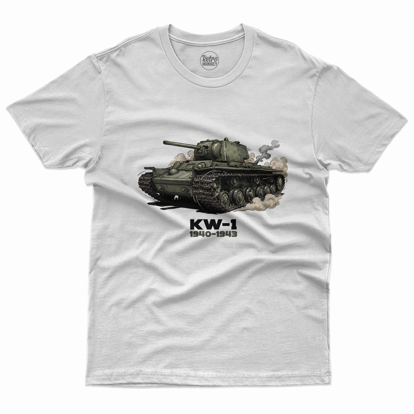 Bawełniana koszulka z potężnym czołgiem ciężkim KW-1. Wysoka jakość nadruku, dwa kolory i militarny design. Idealna propozycja dla fanów historii pancernej i wielbicieli stalowych kolosów.