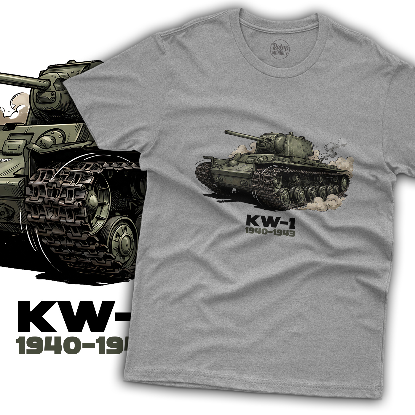 KW-1 był prawdziwym szokiem dla sił przeciwnika w 1941 roku. Jego gruby pancerz sprawiał, że standardowe działa przeciwpancerne były wobec niego bezsilne. Ta koszulka to pokaz surowej i brutalnej siły maszyny, która zyskała miano „ruchomej twierdzy”.
