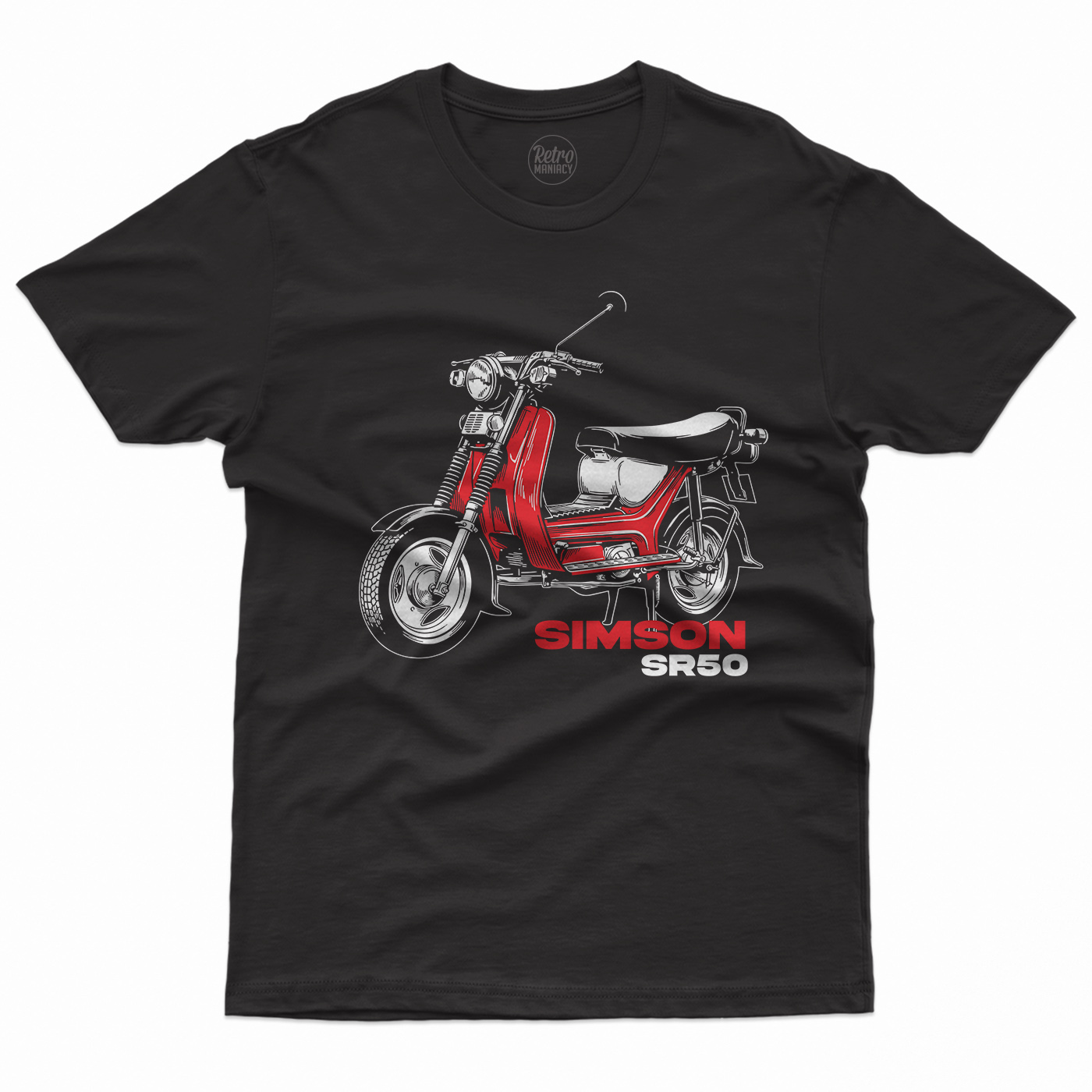 Bawełniana koszulka z kultowym skuterem Simson SR 50. Klasyczny design, wysoka jakość nadruku i czarny kolor. Idealny wybór dla każdego fana ddr-owskiej motoryzacji.