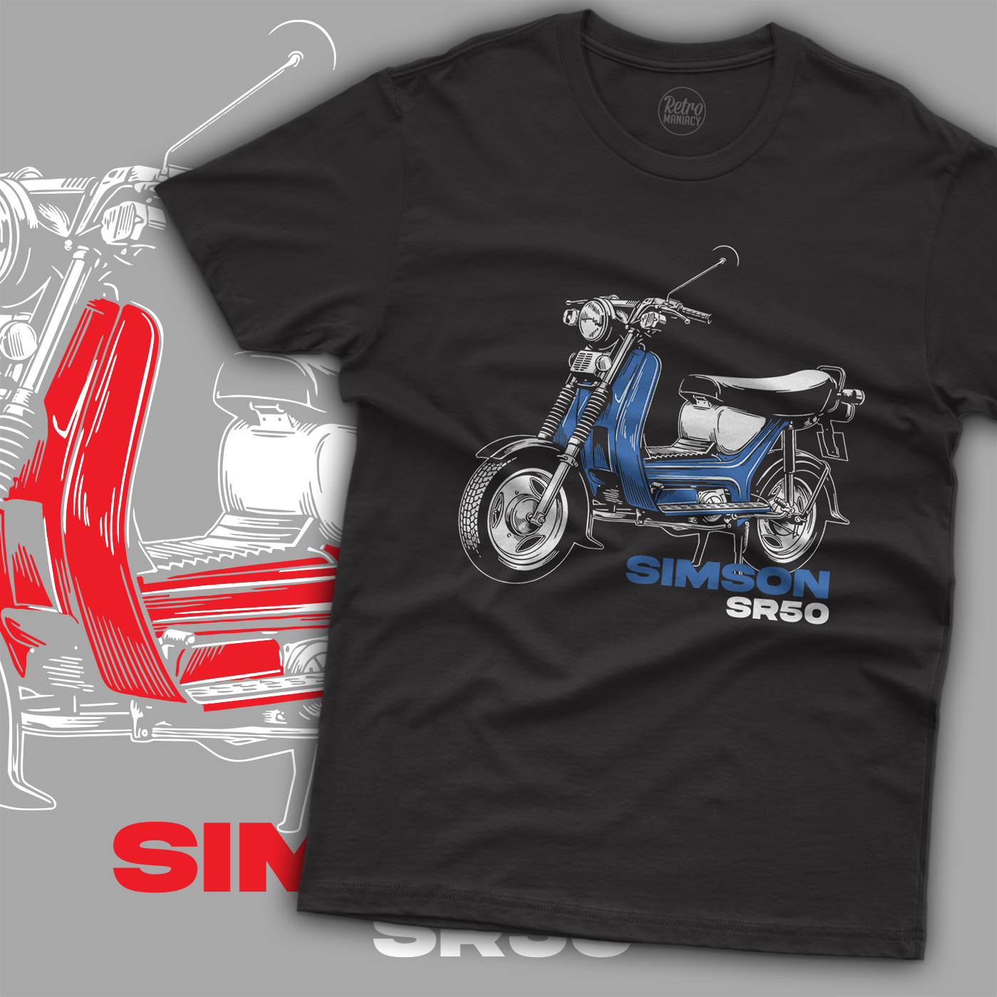 Design i Styl. Grafika na koszulce wiernie oddaje sylwetkę modelu SR 50, podkreślając jego unikalne osłony nóg i kompaktową budowę. Nadruk wykonany w surowym stylu idealnie komponuje się z czarną bawełną, tworząc ubranie, które pasuje zarówno na zlot, jak i na co dzień.