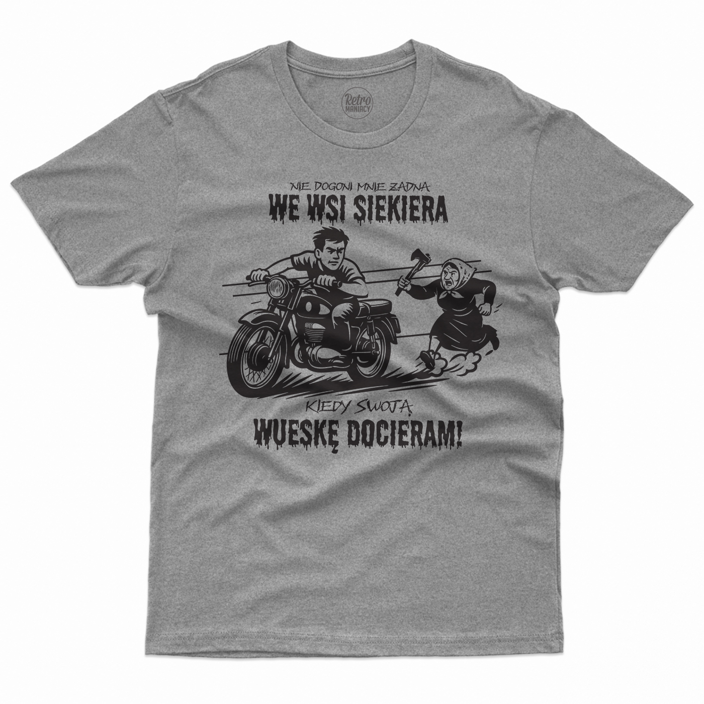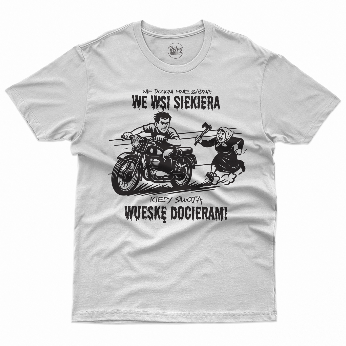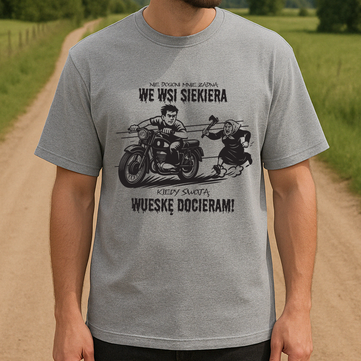 Koszulka dla tych, którzy wiedzą, że wieś to nie sielanka, tylko teren do driftu na Wuesce i survivalu z babcią w trybie kill. Na grafice – klasyk gatunku: motocykl WSK w pełnym biegu i baba z siekierą, która nie odpuści, dopóki nie skończą się jej nerwy albo Twoja benzyna. A jakby tego było mało, na klacie napis, który mówi wprost: Nie dogoni mnie żadna we wsi siekiera, kiedy swoją Wueskę docieram!